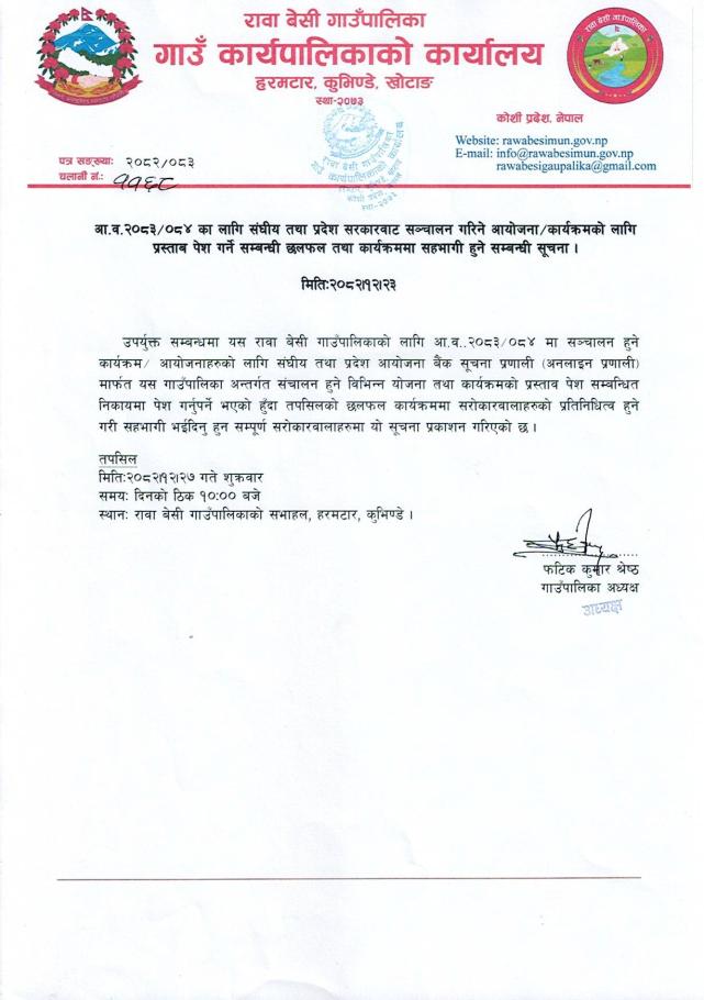आ.व २०८३/०८४ का लागि संघीय तथा प्रदेश सरकारबाट संचालन गरिने आयोजना/ कार्यक्रमको लागि प्रस्थाव पेश गर्ने सम्बन्धी छलफल तथा कार्यक्रममा सहभागी हुने सम्बन्धी सूचना !!
